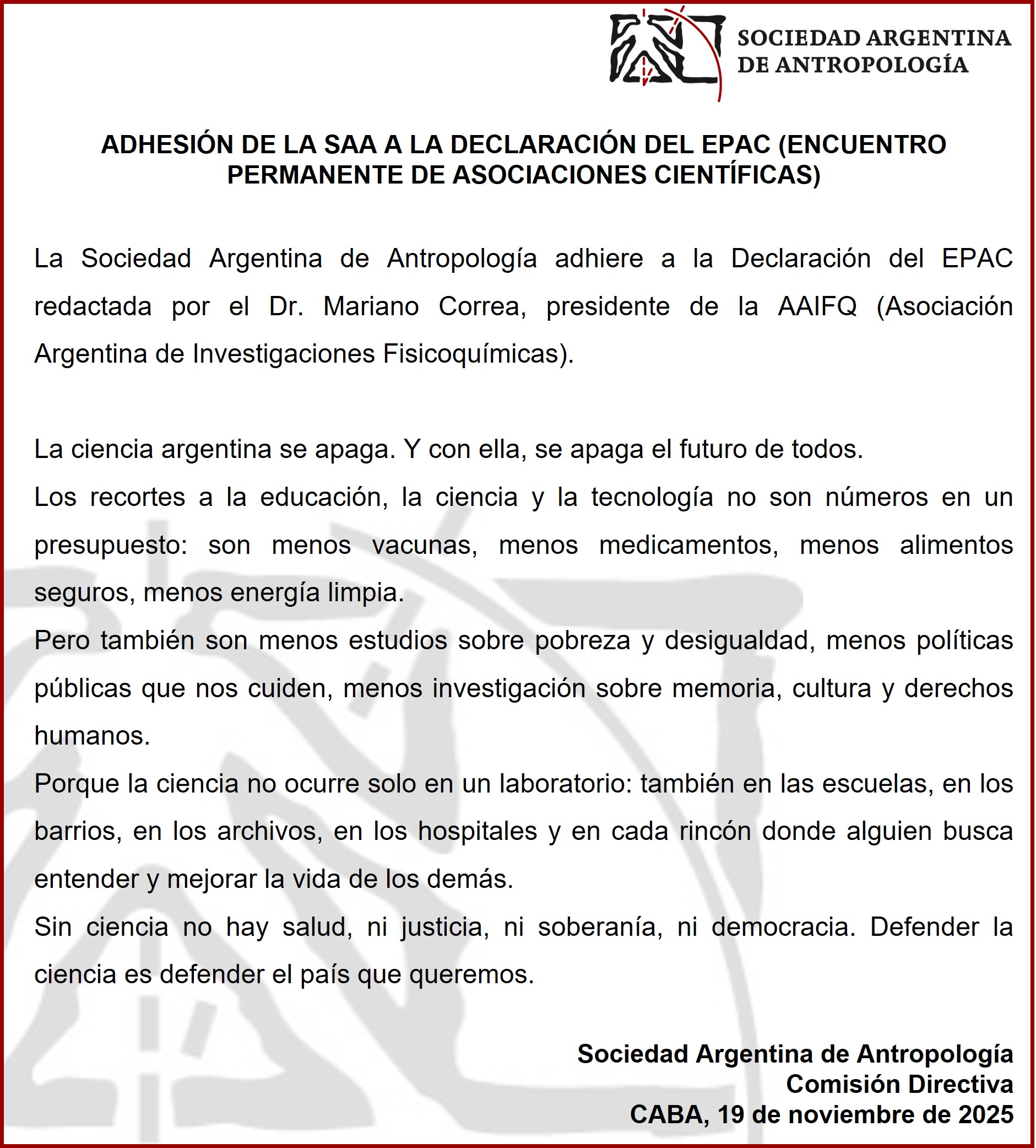 La Sociedad Argentina de Antropología adhiere a distintos documentos y comunicados que pueden consultarse en https://aargentinapciencias.org/category/declaraciones-y-comunicados/